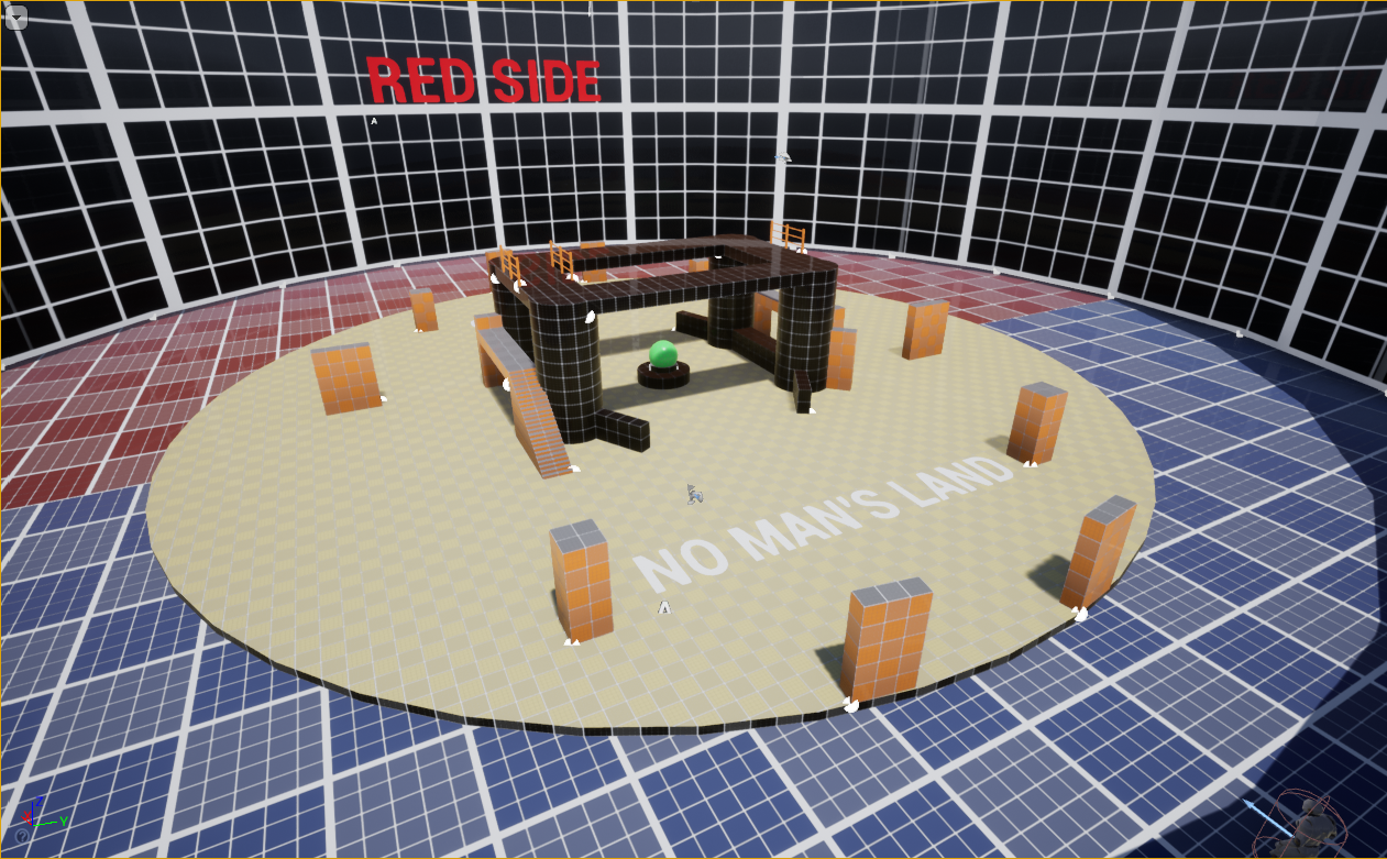 The map is broken up into 3 distinct zones, Red side (for the red player, Blue side (for the blue player), and No Man’s Land. Red side is hostile to Blue players, and Blue side is hostile to Red players. Both Red and Blue sides are completely barren. However, No Man’s Land provides obstacles for the players to use as parkour, cover, traversal or hiding opportunities.